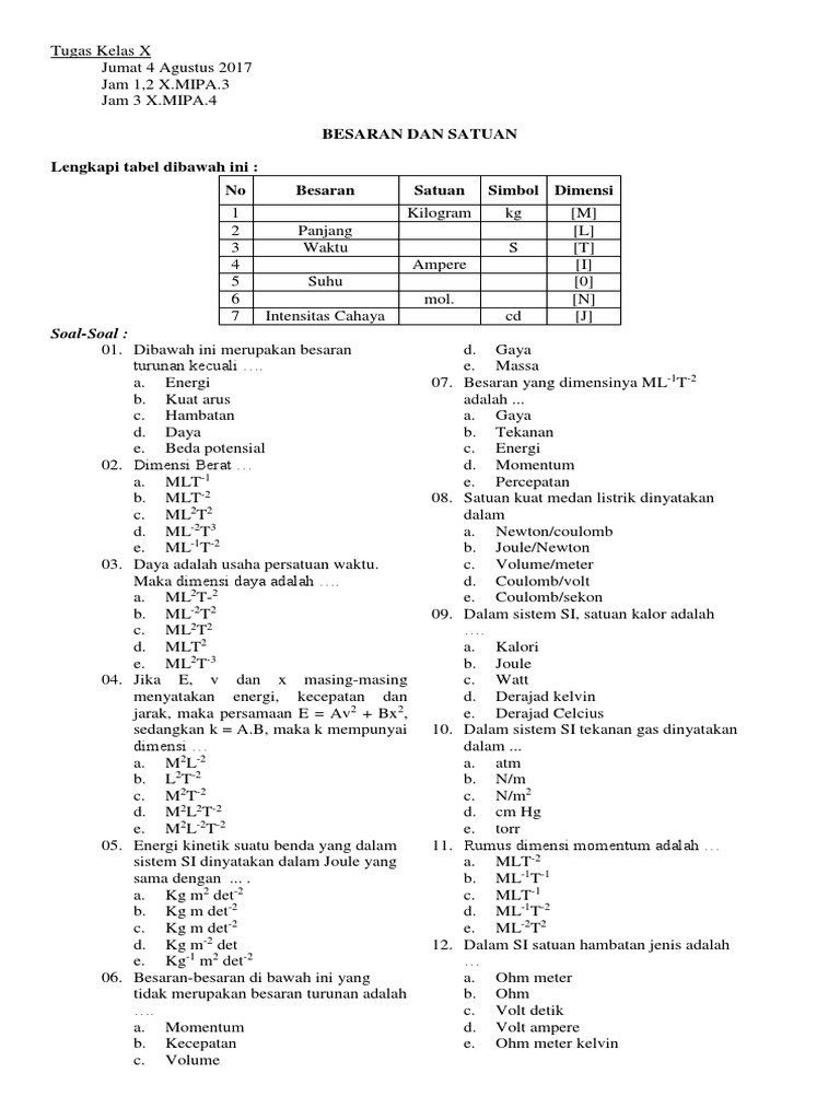 Besaran pokok materi besaran pada ilmu fisika adalah sesuatu yang mempunyai nilai hingga bisa diukur dan dihitung. Contoh besaran non fisika ialah jumlah. Berikut adalah contoh besaran pokok dan besaran turunan yang disertai dengan tabel dan dimensi besaran turunan yang mungkin mampu membantu dalam menyelesaikan tugas sekolah. Besaran yang dimensinya ml 1t 2 adalah.