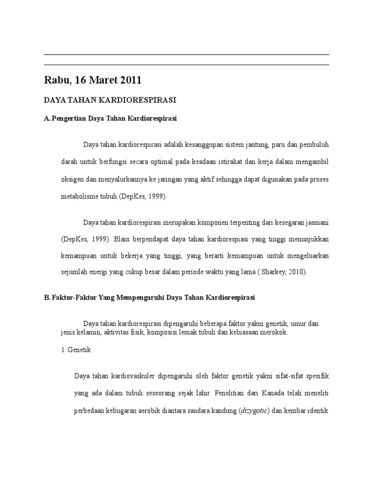 Daya tahan kardiorespirasi dipengaruhi beberapa faktor yakni genetik umur dan jenis kelamin aktivitas fisik komposisi lemak tubuh dan kebiasaan merokok. Melakukan tes kebugaran dan memberikan saran gizi. Apakah efek immeadiate dari latihan daya tahan kardiorespirasi menurunkan aliran darah melalui otak. Pengertian daya tahan kardiorespirasi daya tahan kardiorespirasi adalah kesanggupan sistem jantung paru dan pembuluh darah untuk berfungsi secara optimal pada keadaan istirahat dan kerja dalam mengambil oksigen dan menyalurkannya ke jaringan yang aktif sehingga dapat digunakan pada proses metabolisme tubuh depkes 1999.