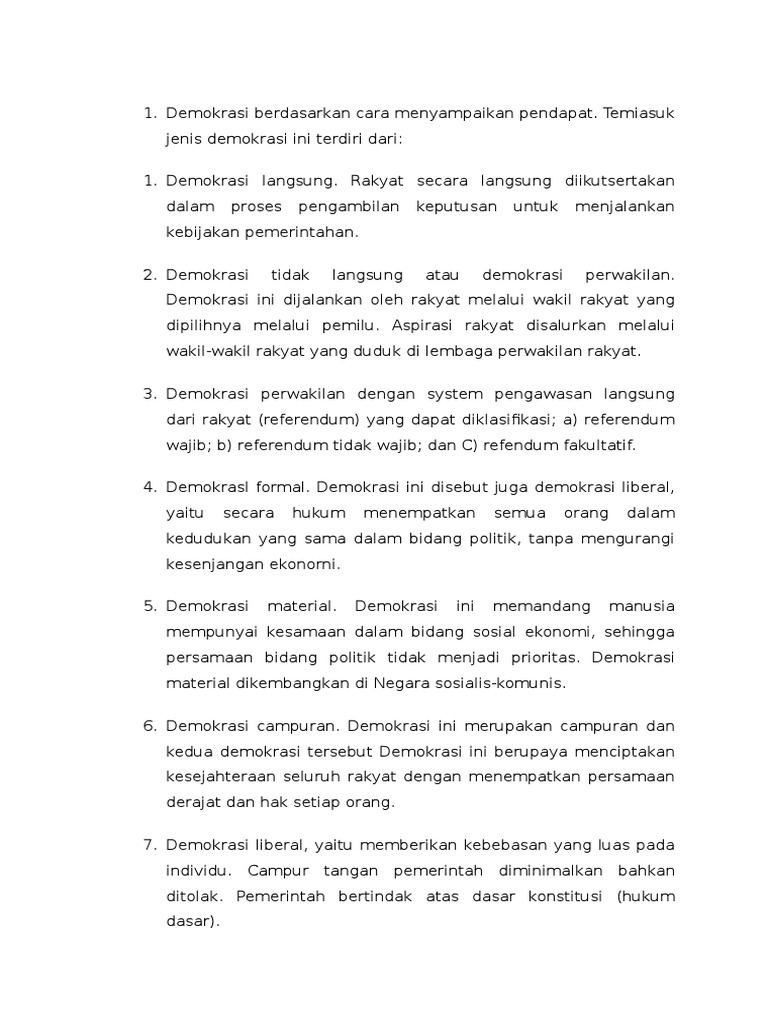 Referendum diklasifikasikan menjadi tiga macam yaitu. Ada beberapa jenis demokrasi yang diterapkan di berbagai negara di dunia namun macam macam demokrasi tersebut dapat dibedakan menjadi beberapa kelompok. Sehingga bisa memberikan kritik dan saran kepada pemerintah sebagai pemuat kebijakan publik. Awal orde baru memberi harapan baru pada rakyat pembangunan disegala bidang melalui pelita i ii iii iv v dan berhasil menyelenggarakan pemilu tahun 1971 1977 1982 1982 1987 1992.