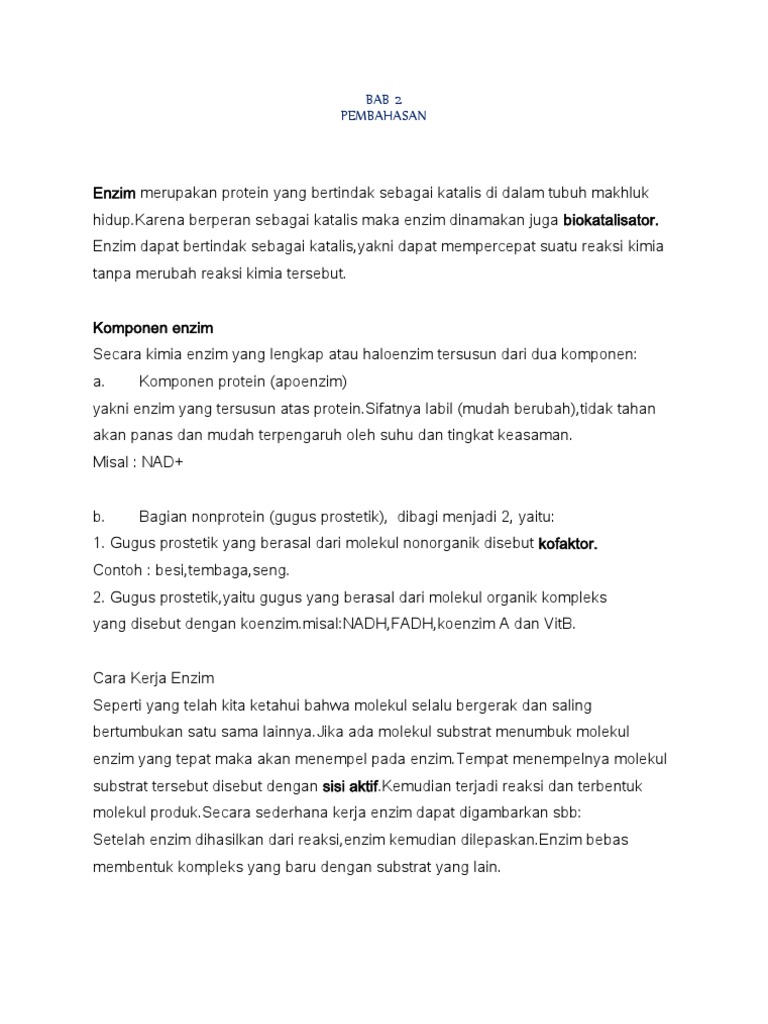 Setiap enzim bertindak paling cekap pada nilai ph tertentu yang disebut sebagai ph optimum. Kata enzim berasal dari en zyme yang berarti dalam ragi yeast mulai dipakai sejak 1877. Molekul awal yang disebut substrat akan dipercepat perubahannya menjadi molekul lain yang disebut produk. Umumnya enzim tak dapat bekerja tanpa adanya suatu zat non protein tambahan yang disebut kafaktor.