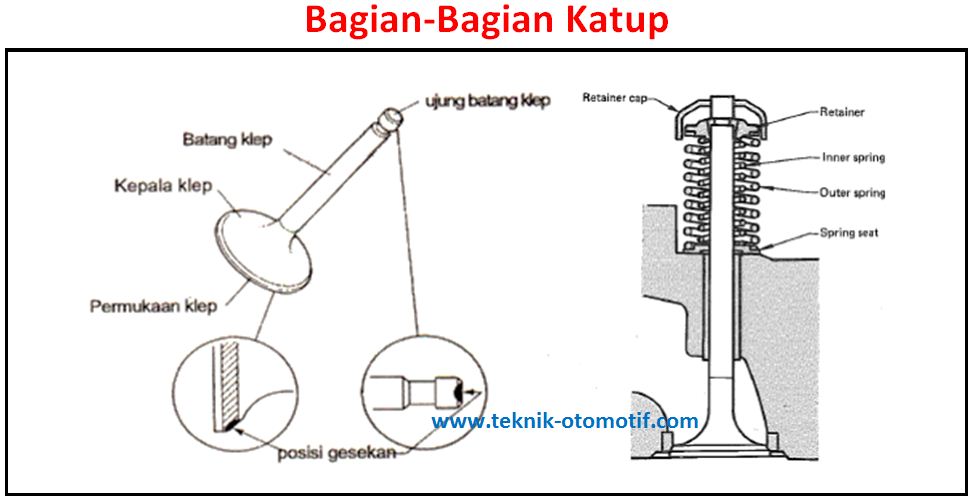 Mekanisme katup mempunyai dua kegunaan yaitu mengatur pemasukan campuran udara dan bahan bakar ke ruang bakar dan mengatur pembuangan gas hasil sisa pembakaran ke udara luar.
