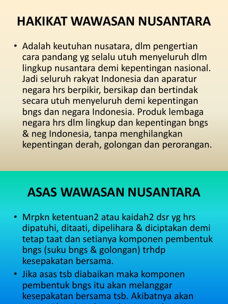 Jadi hakikat wawasan nusantara merupakan keutuhan dan kesatuan wilayah nasional atau persatuan bangsa dan wilayah. Jadi hakikat wawasan nusantara ini ialah keutuhan serta kesatuan wilayah nasional atau persatuan bangsa serta wilayah. Serta mampu memandang kesatuan dan keberagaman bangsa sebagai substansi kehidupan berbangsa dan. Berarti setiap warga negara bangsa dan aparatur negara harus berfikir bersikap dan bertindak secara utuh menyeluruh dalam lingkup dan demi kepentingan bangsa termasuk.