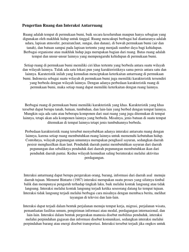 Merupakan bentuk yang paling utama dalam proses interaksi sosial karena interaksi sosial yang dilakukan oleh seorang kelompok orang bertujuan untuk memenuhi kepentingan kebutuhan bersama. Terdapat beberapa bentuk dari interaksi antarruang diantaranya. Interaksi dalam bentuk pergerakan manusia disebut mobilitas penduduk interaksi melalui perpindahan gagasan dan informasi disebut komunikasi sedangkan interaksi melalui perpindahan barang atau energi disebut transportasi. Interaksi tersebut terjadi jika ongkos untuk melakukan interaksi antar daerah asal dan tujuan lebih rendah dari keuntungan.