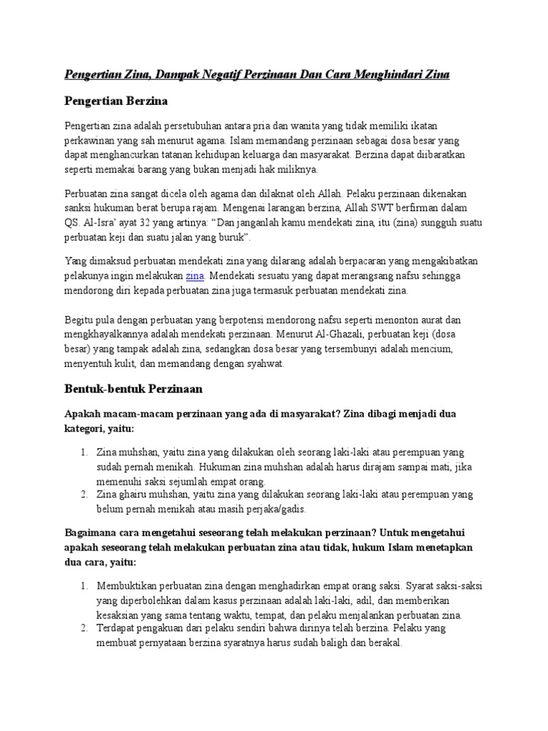 Bentuknya adalah hubungan kelamin yang dilakukan oleh seorang mukallaf yang dilakukan dengan keinginannya pada wanita yang bukan haknya di wilayah. Para ulama sepakat bahwa hukuman terhadap pezina muhsan adalah dirajam yaitu dikubur sampai batas pundak dan dilempari dengan batu sampai meninggal. Secara bahasa zina berasal dari kata zana yazni yang artinya hubungan persetubuhan antara perempuan dengan laki laki yang sudah mukallaf balig tanpa akad nikah yang sah. Pengertian zina macam macam zina dan contohnya hukum zina hukuman bagi pelaku zina serta dampak akibat perbuatan zina terlengkap zina adalah melakukan hubungan badan antara laki laki dan perempuan tanpa adanya suatu ikatan pernikahan yang sah menurut syariat agama tanpa adanya paksaan dan dilakukan secara sadar.