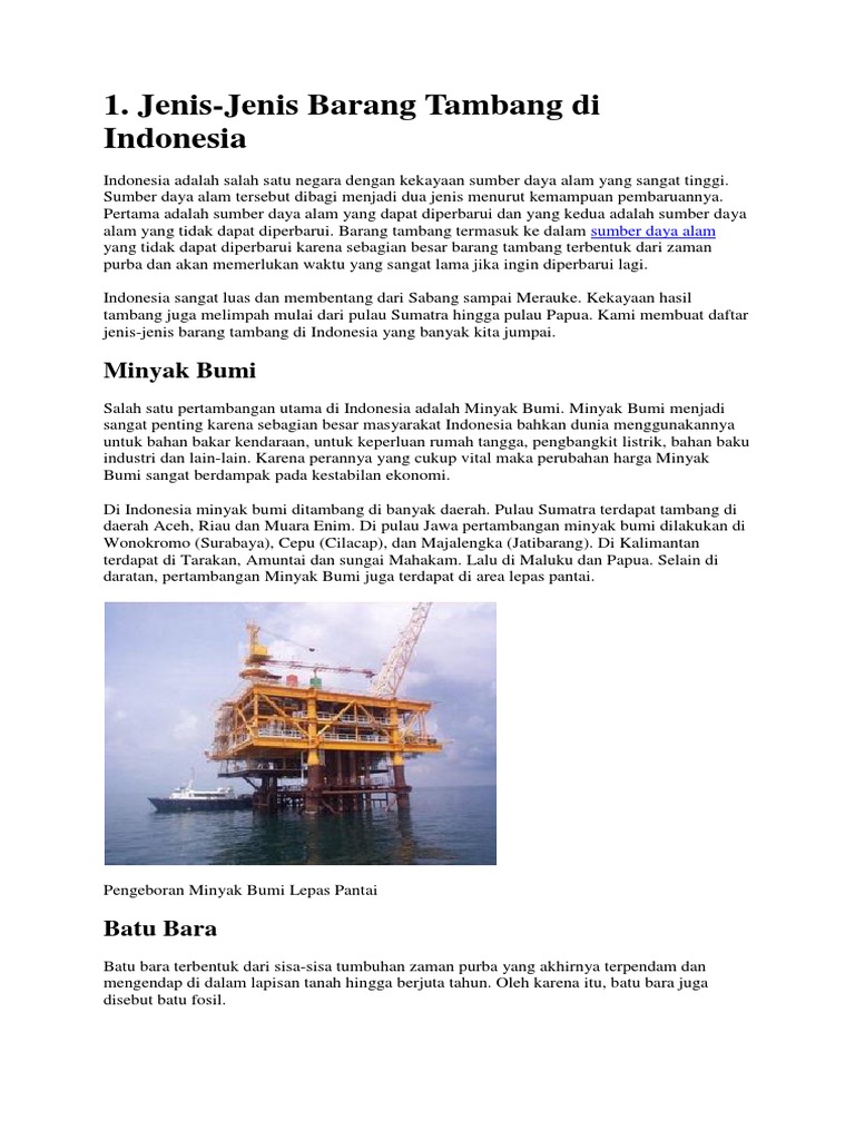 Pada saat mengekstraksi minyak dari tanah minyak tersebut keluar masih dalam bentuk minyak mentah yang berwarna hitam. Sumber daya alam sda terdiri atas sda yang dapat diperbaharui renewable dan sda yang tidak dapat diperbaharui unrenewable bahan tambang diantaranya batu bara dan minyak bumi termasuk sebagian yang tergolong dalam unrenewable karena ketersediaannya di muka bumi yang sangat terbatas dan proses pembentukannya memerlukan waktu sangat lama bahkan mencapai ribuan tahun. Minyak adalah bahan bakar fosil cair yang berasal dari olahan fosil binatang yang berumur ribuan tahun lalu. Tambang tambang minyak bumi yang ada di indonesia antara lain di pulau sumatera seperti di aceh riau dan juga muara enim.