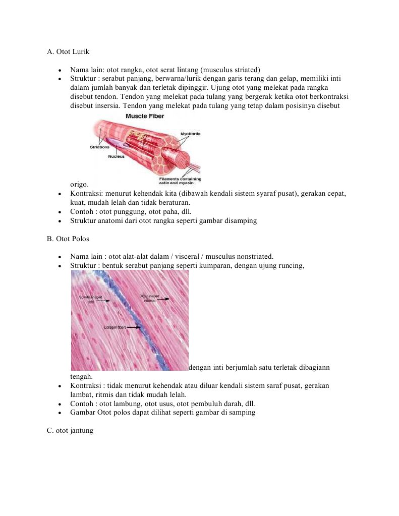 Masing masing jaringan otot ini memiliki fungsi ciri ciri dan sistem kerja yang berbeda beda. Bila otot berkontraksi maka tulang tulang tempat otot melekat akan tertarik sehingga tulang turut bergerak. Otot lurik dapat ditemukan pada sistem rangka otot ini melekat di tulang kita. Berdasarkan bentuk morfologis sistem kerja dan letaknya dalam tubuh otot dibedakan menjadi 3 tiga jenis yaitu otot lurik otot jantung dan otot polos.