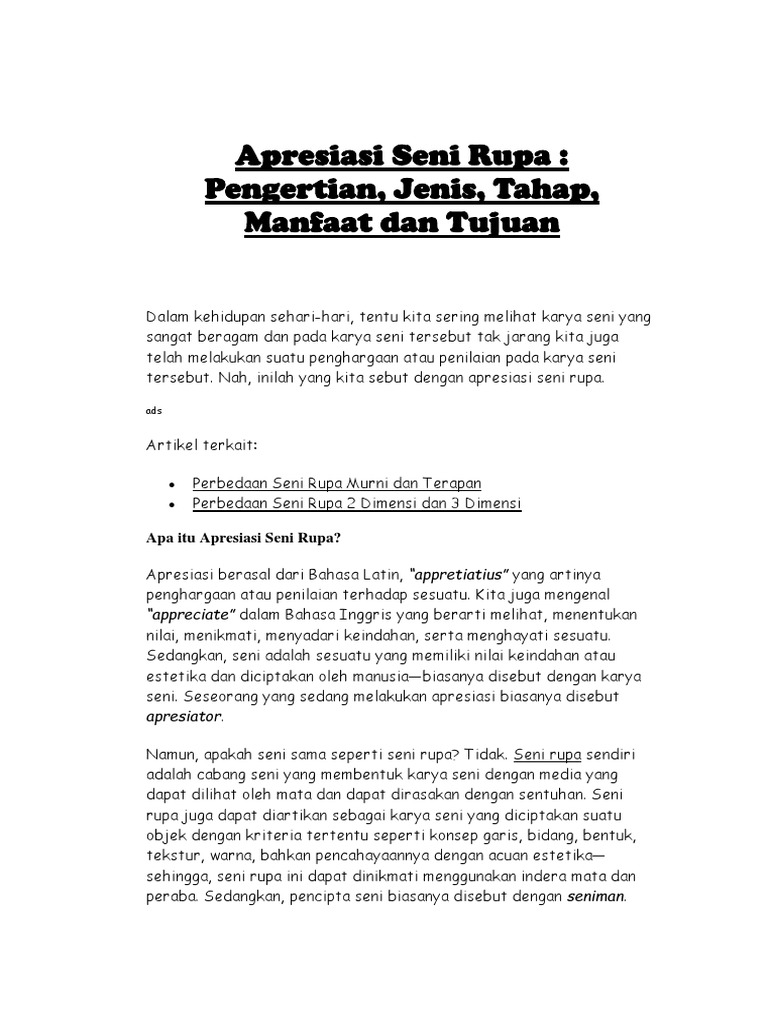 Tujuan apresiasi dan manfaat apresiasi apabila mengacu dalam cabang ilmu seni maka terdapat beberapa tujuan dari apresiasi. Apa yang dimaksud dengan resensi. Apresiasi seni menurut brent g. Pendapat lain mengatakan pengertian resensi adalah suatu kegiatan membahas menilai mengkritik atau mengungkapkan kembali isi sebuah karya dengan memberikan sinopsis data serta kritikan dan masukan terhadap karya.