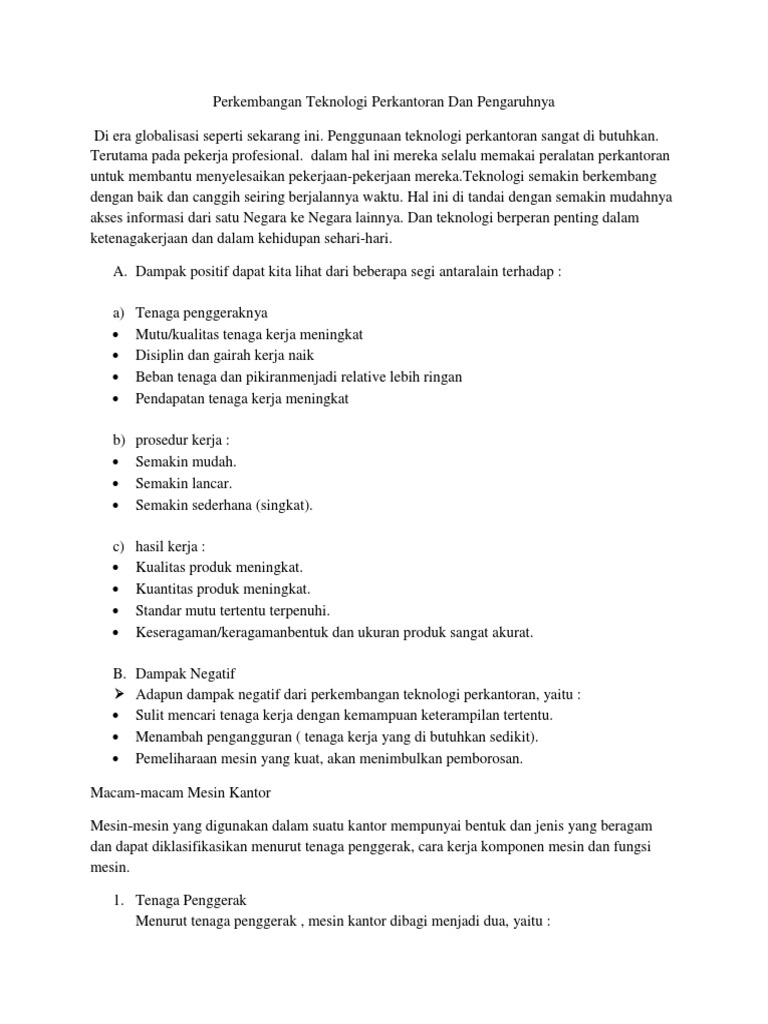 Dampak perkembangan teknologi informasi. Pertumbuhan ekonomi yang semakin tinggi. 67 menyatakan bahwa sebenarnya sejak dahulu teknologi sudah ada atau manusia sudah menggunakan teknologi. Perkembangan ilmu dan teknologi yang semakin pesat serta perlatan mesin kantor yang digunakan semakin canggih maka hal ini dapat mempengaruhi efisiensi kerja.