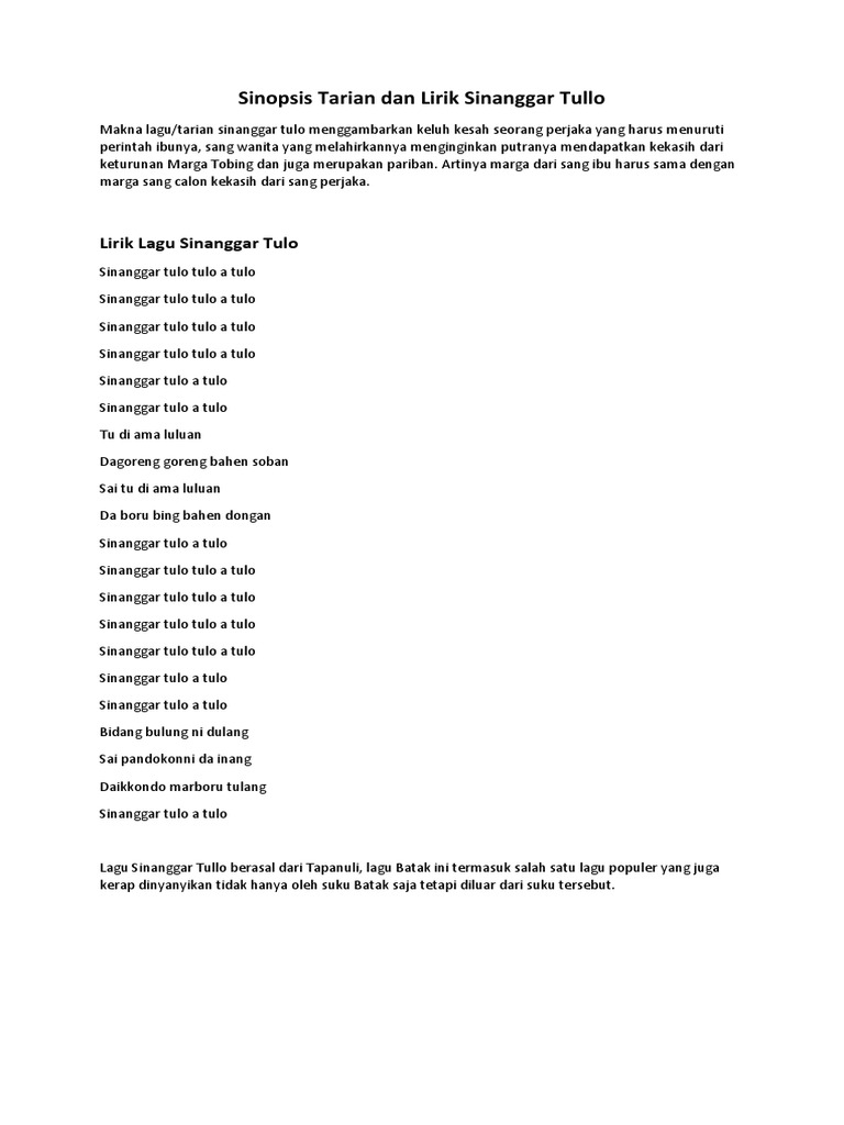 Sengko sing sing so mariam tomong lisoi anju ahu butet dago inang sarge rambadia. Lagu sinanggar tulo berasal dari sumatra utara yang merupakan sebuah lagu sajak berirama. Lirik lagu sinanggar tulo sumatera utara arti dan makna by kisah nusantara november 15 2016 sumatera utara lagu daerah informasi lirik makna arti dan sejarah lagu daerah sinanggar tulo salah satu lagu daerah yang berasal dari provinsi sumatera utara. Lagu sinanggar tullo berasal dari tapanuli lagu batak ini termasuk salah satu lagu populer yang juga kerap dinyanyikan tidak hanya oleh suku batak saja tetapi diluar dari suku tersebut.