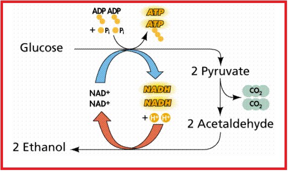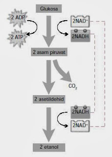 Prosesnya diawali dengan perubahan glukosa menjadi asam piruvat melalui proses glikolisis. Menghasilkan 2 atp 2 co2 2 asetaldehid yang kemudian jadi 2 etanol. Proses ini terjadi pada beberapa mikroorganisme seperti jamur ragi dimana tahapan glikolisis sama dengan yang terjadi pada respirasi aerob. Proses tanpa butuh oksigen itu karena di mitocondria oksigen praktis tidak ada sehingga akseptor elektron pada fosforilasi elektron bukan oksigen digantikan oleh senyawa asetaldehid.