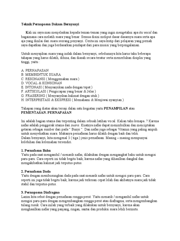 Istilah kata vokal juga berasal dari bahasa latin vocalis dengan berarti berbica atau berbunyi vokal dalam pengertian seni musik adalah iringan nada nada yang keluar dari suara manusia. Berikut ini kita akan membahas menganai teknik pernafasan untuk bernyanyi. Teknik pernapasan dalam bernyanyi teknik pernapasan dalam bernyanyi. Oleh karena itu usahakan mengisi paru paru sebanyak mungkin waktu menyanyi.