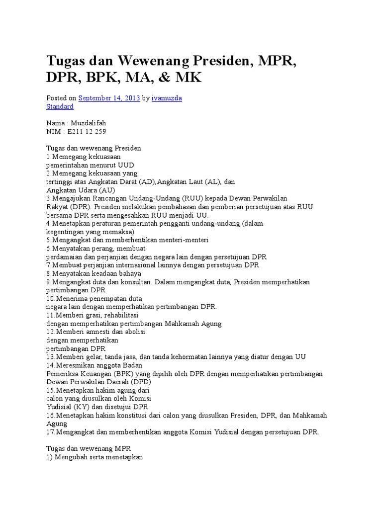 Tugas dan wewenang presiden wapres mpr dpr dpd bpk salamadian september 10 2018 0 tugas dan wewenang lembaga negara merupakan suatu lembaga pemerintahan yang berada didalam suatu negara dan dibuat dengan tujuan membantu membangun negara tersebut. Presiden adalah nama suatu jabatan yang digunakan untuk pimpinan suatu organisasi perusahaan perguruan tinggi atau negara. Hak atau wewenang presiden tersebut juga telah tertuang dalam peraturan perundangan undangan yaitu undang undang dasar 1945. Selain harus melaksanakan tugas dan kewajiban seorang presiden sebagai kepala negara dan kepala pemerintahan presiden juga memiliki hak atau wewenangnya sendiri dalam memimpin suatu negara.