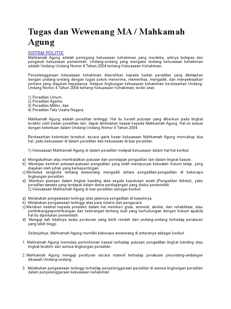 Erat kaitannya dengan fungsi peradilan ialah hak uji materiil yaitu wewenang menguji menilai secara materiil peraturan perundangan dibawah undang undang tentang hal apakah suatu peraturan ditinjau dari isinya materinya bertentangan dengan peraturan dari tingkat yang lebih tinggi pasal 31 undang undang mahkamah agung nomor 14 tahun 1985. Kali ini akan dibahas mengenai tugas tugas dan wewenang mahkamah agung ma lengkap beserta hak hak dan fungsinya menurut uud 1945. Pimpinan mahkamah agung terdiri atas seorang ketua dua wakil ketua dan beberapa orang ketua muda. Mahkamah agung memutus permohonan kasasi terhadap putusan pengadilan tingkat banding atau tingkat terakhir dari semua lingkungan peradilan.